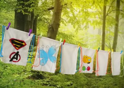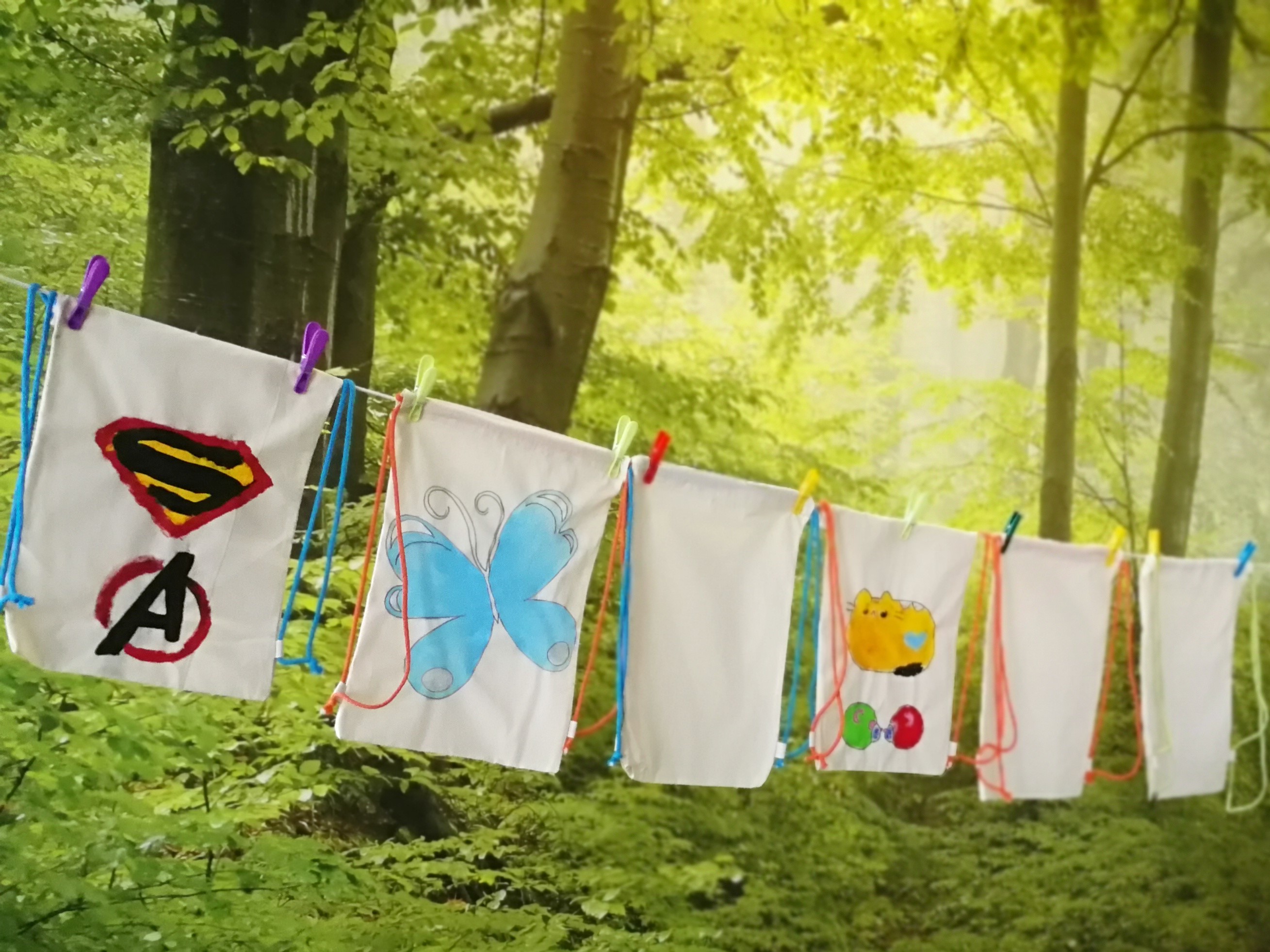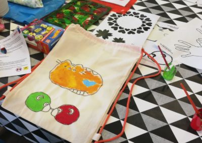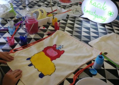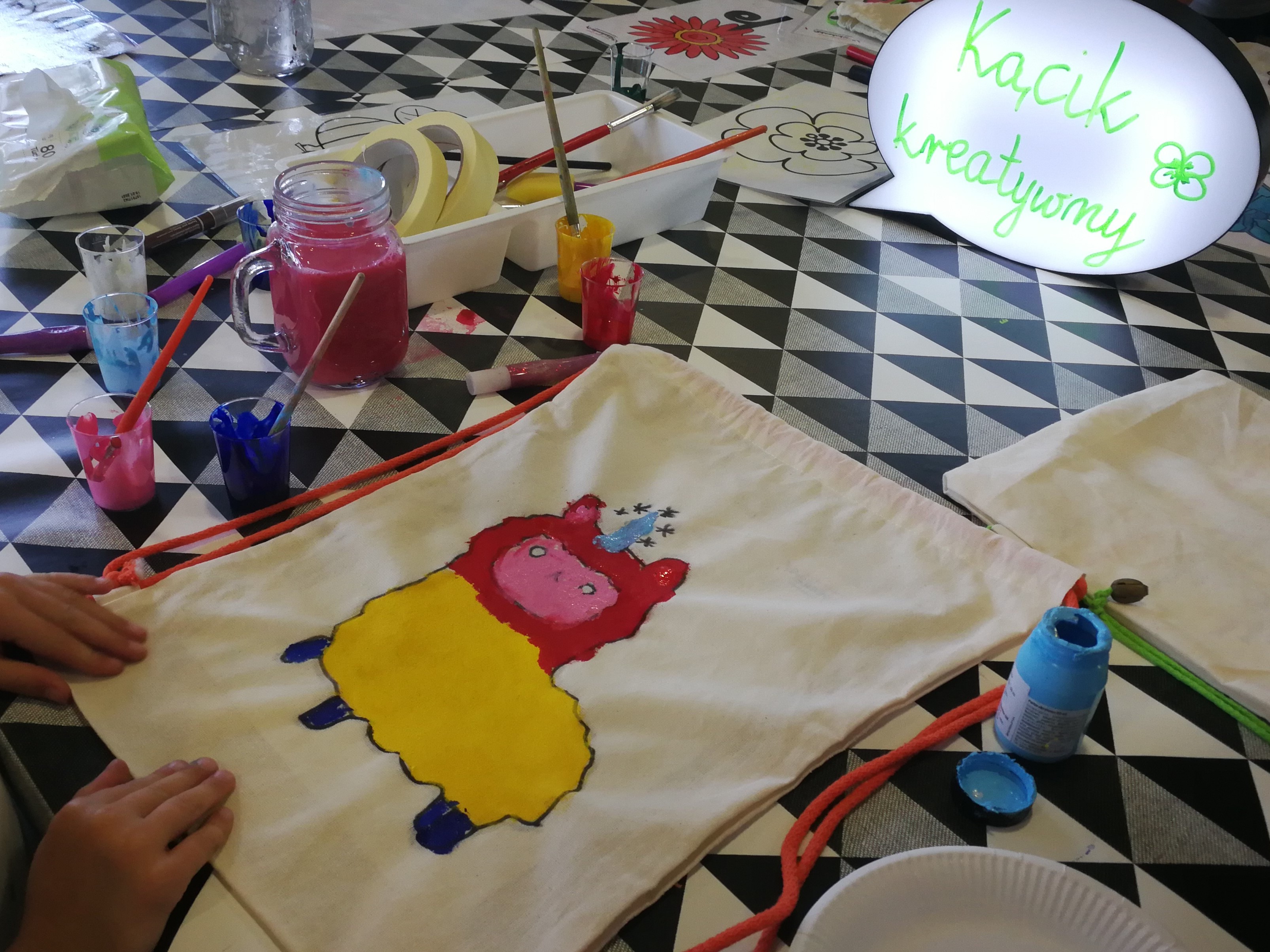 Ale się działo! Podczas warsztatu malowania na tkaninie uczestnicy mogli wybrać wzór z szablonu lub stworzyć swój własny – niepowtarzalny. Dobieranie kolorów, mieszanie farb, kreatywne wzory – pomysłom nie było końca, dzięki temu powstały wyjątkowe dzieła. Taką samodzielnie stworzoną workotorbę na pewno chętnie dzieci zabiorą ze sobą do szkoły lub przedszkola.